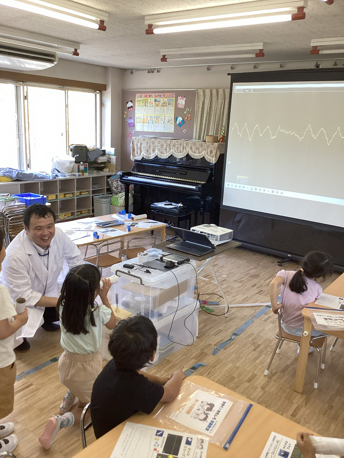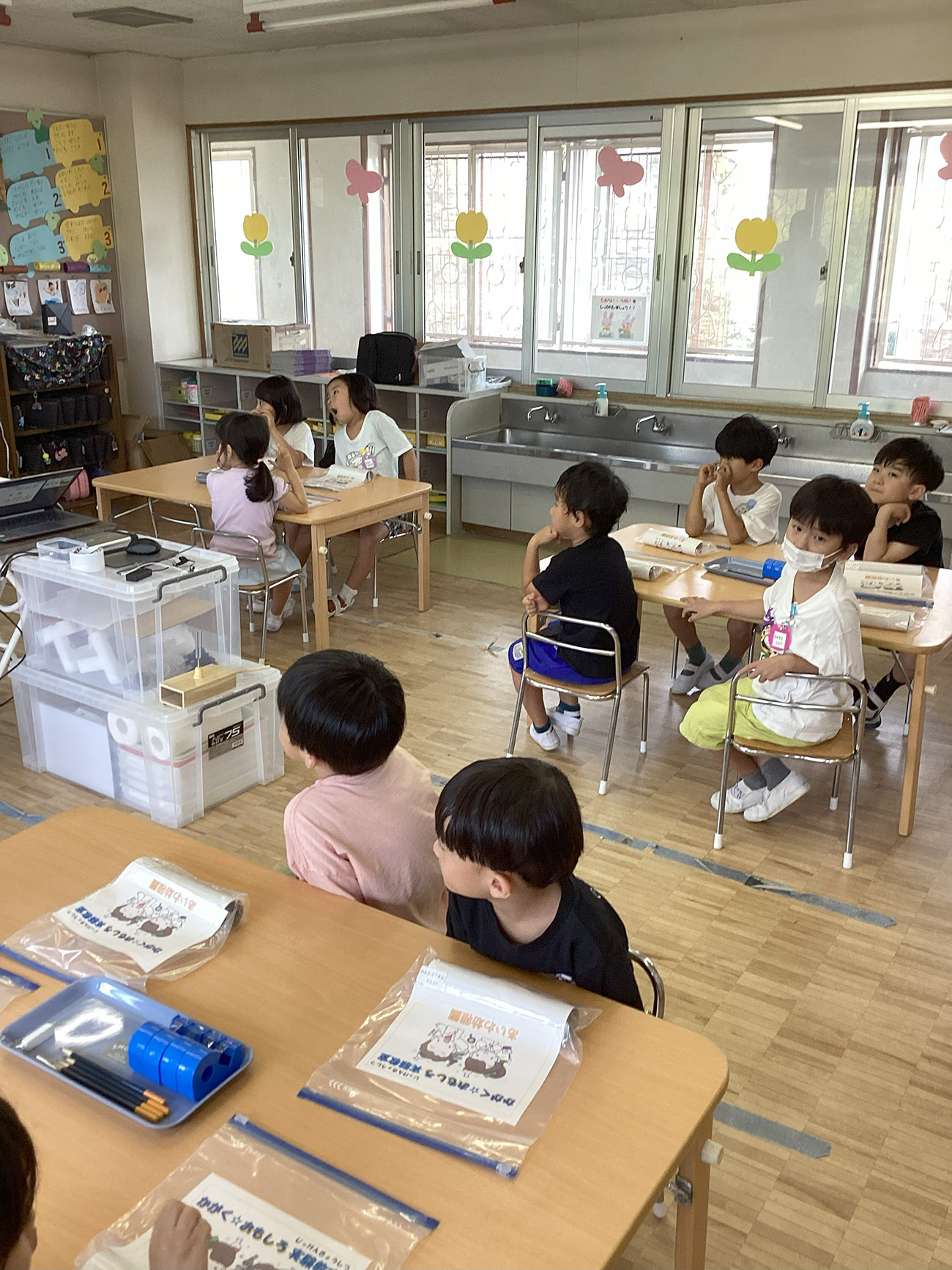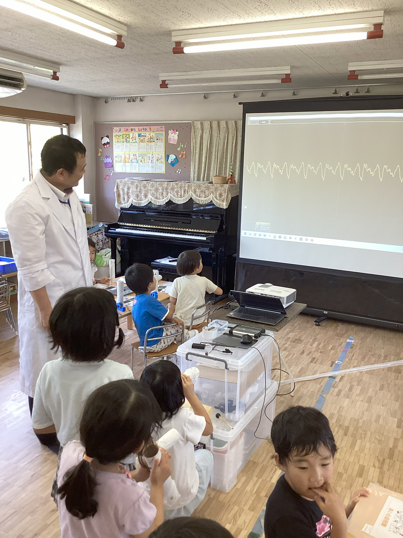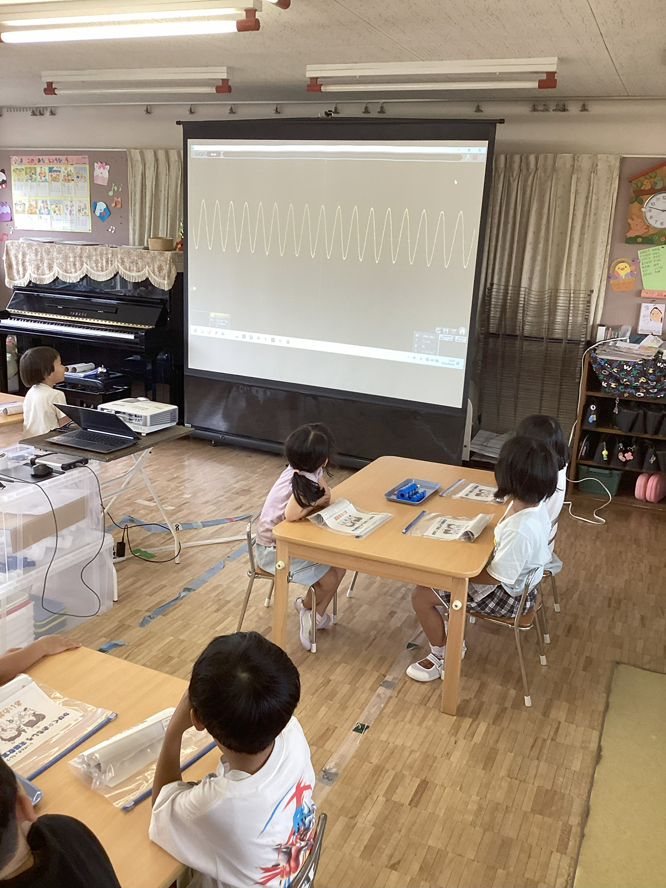 さらに、その音をオシレーターで見て「どんな波の形になるのかな?」と予想しました。中には、実際の波形にとても近い形を描けた子もいてびっくりです😲👏最後は一人ずつ、自分の声をボイスチェンジャーで響かせて波の形を確認!笑顔があふれる時間となりました。                🔦次回のテーマは『光』~ひかりのふしぎ~です。どうぞお楽しみに✨