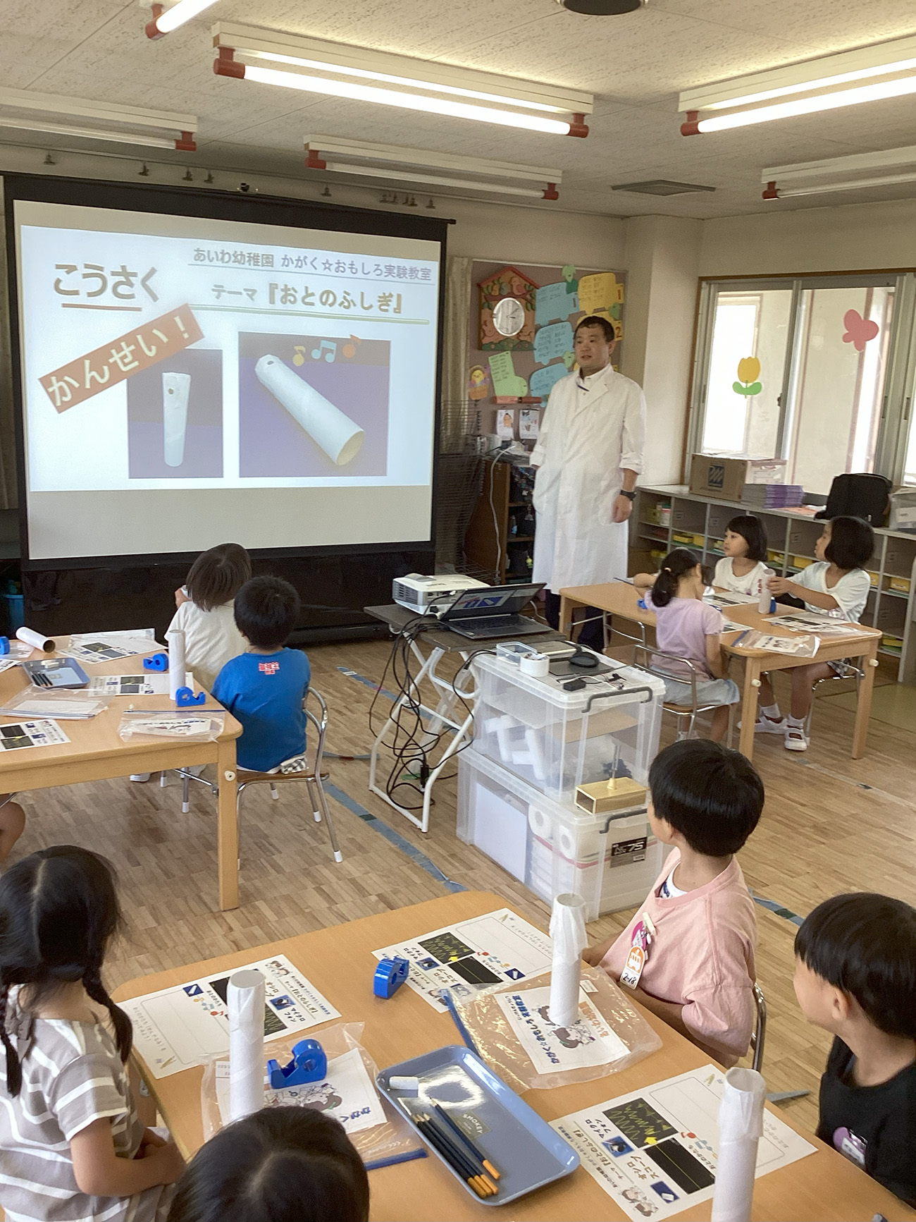 本日、かがく☆おもしろ実験教室 第2クール 第2回目 『音』 ~おとのふしぎ~を開催しました🎶 最初に細江先生から「音は振動が空気を伝わって届くんだよ」という少し難しいお話がありましたが、子どもたちは目をキラキラさせながら真剣に耳を傾けていました👂✨次は、オシレーターを使って音叉やピアノの音を比べてみました。音によって振動の仕方が違うことを実際に見て、子どもたちは「すごい!」と大喜び!工作タイムでは、丸い筒に紙を張って「簡易ボイスチェンジャー」を作成🎤