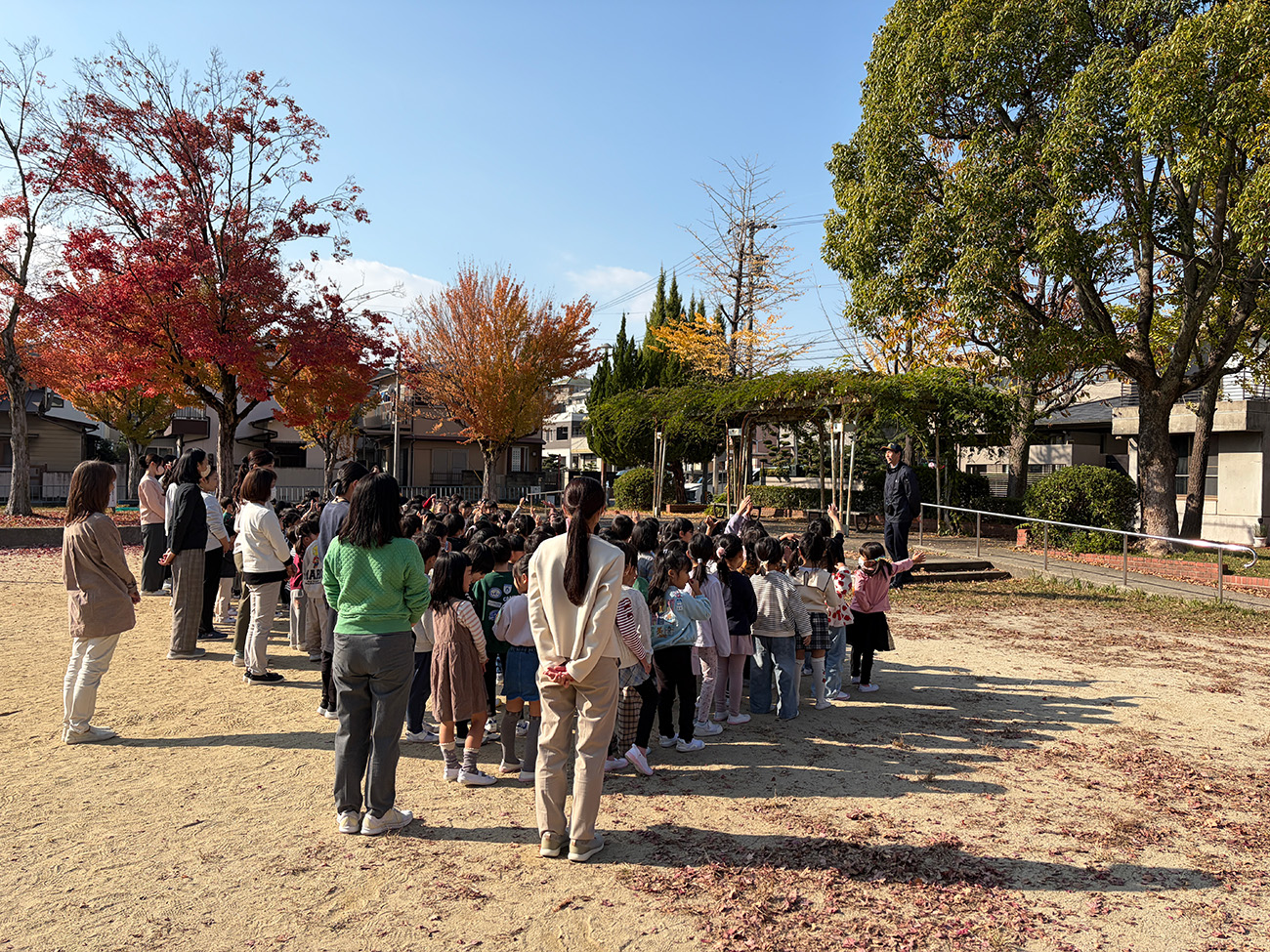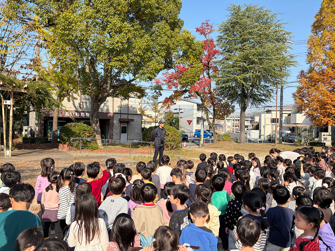今日は、名東消防署から消防士のお兄さんが来てくださり、あいわ幼稚園から神里公園までの避難訓練を行いました。まずは避難の様子を見ていただいたのですが、子どもたちが煙を吸い込まないようにしっかりと手で口と鼻を押さえて歩く姿に、消防士さんから「とても上手だね!」とおほめの言葉をいただきました。その後は、避難するときの大切な約束「おはしもち」のお話。