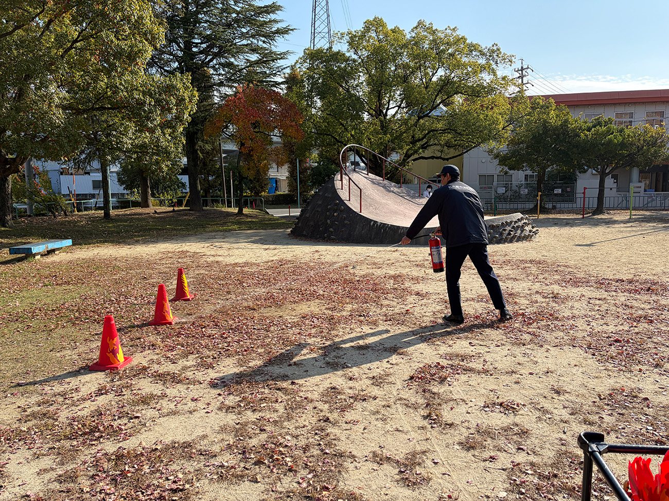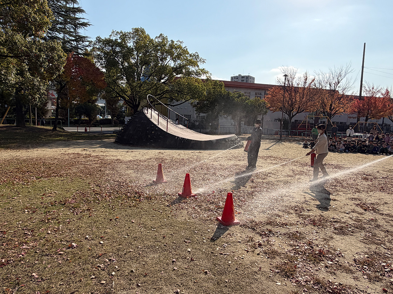 そのあと先生たちも挑戦!消火器をしっかり構えて、火の的を狙って噴射!見事命中し、みんなから拍手が起こりました。子どもたちも先生たちも、とても落ち着いて、上手に避難訓練することができました。ためになるお話や消火器の使い方を丁寧に教えてくださった消防士のお兄さん、本当にありがとうございました!