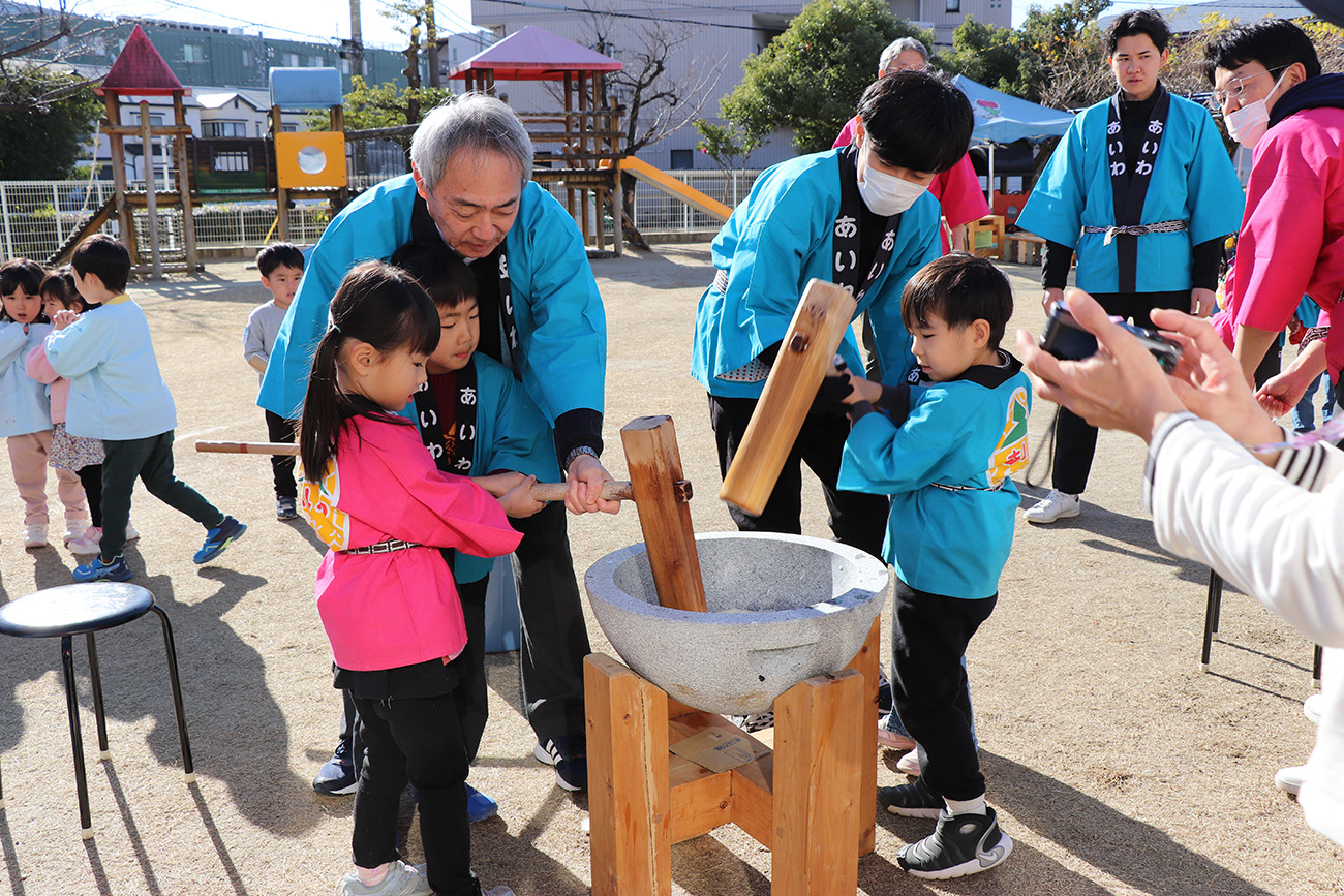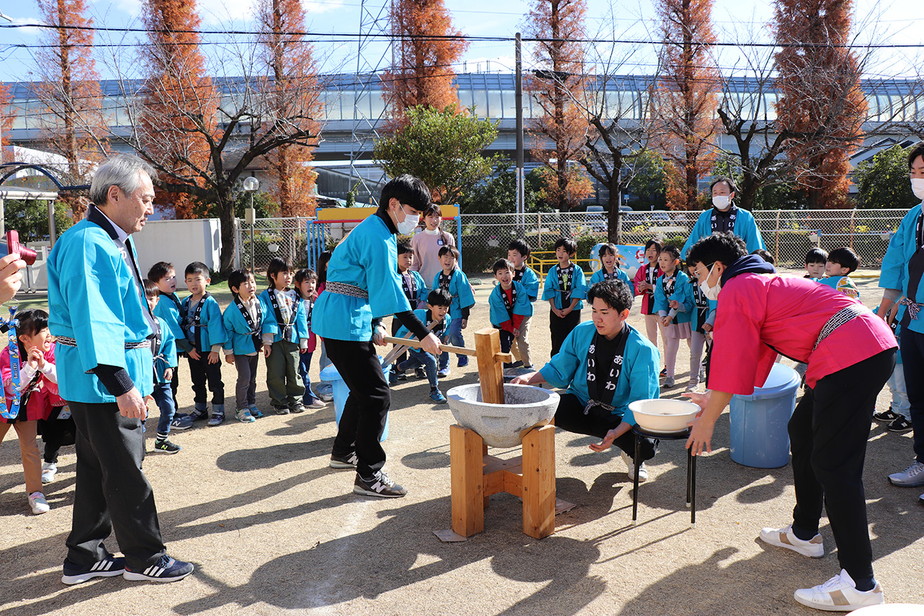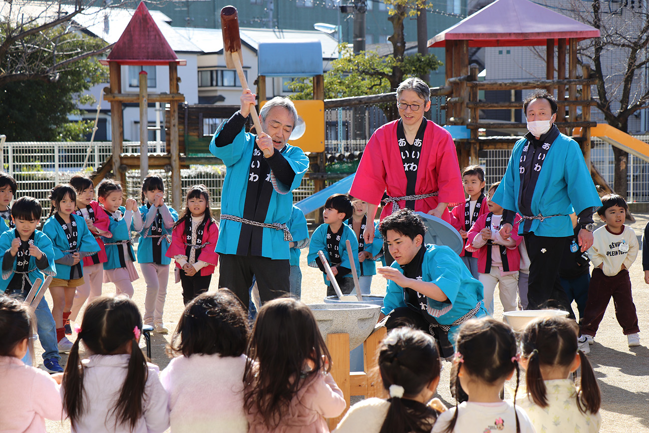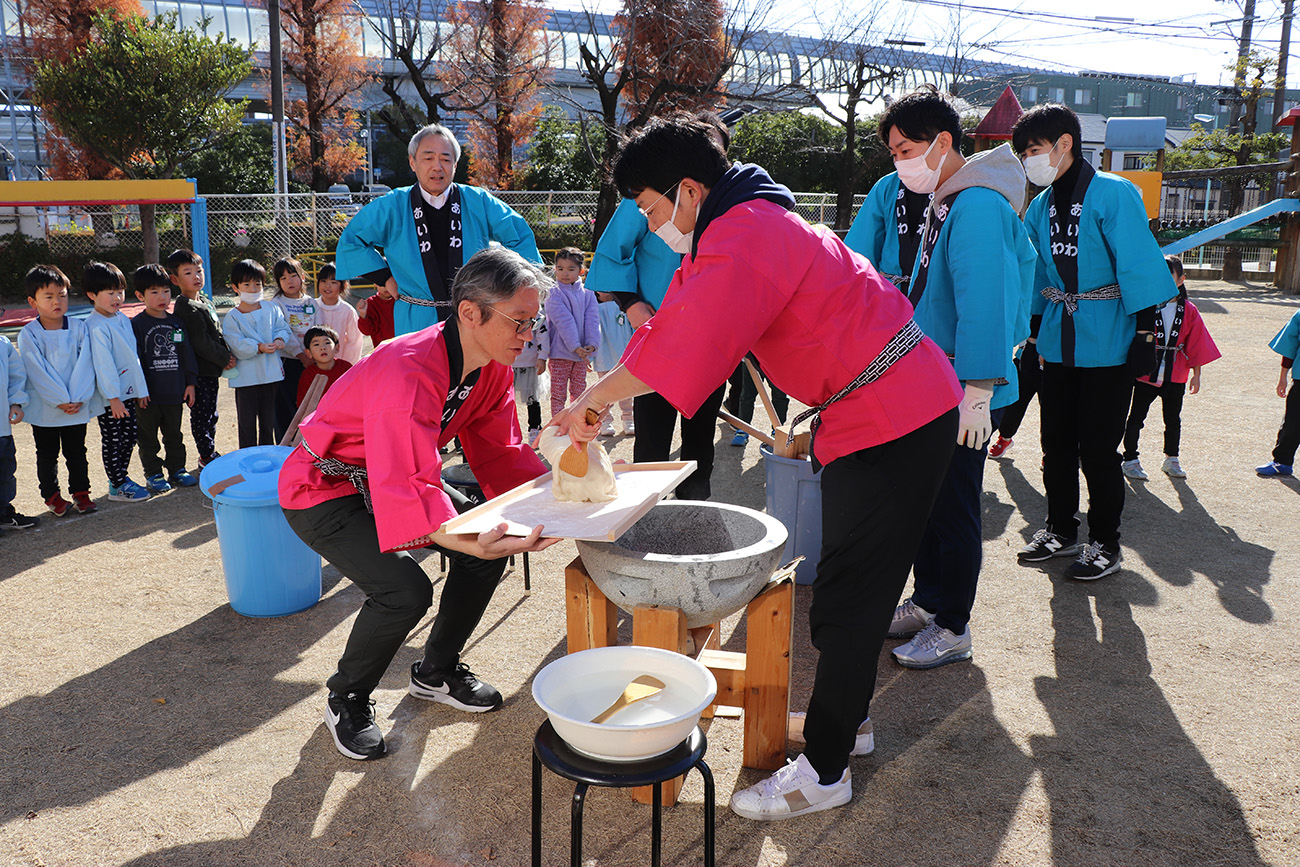 今年も幼稚園の恒例行事「もちつき」を行いました🎍園長先生と愛知工業大学の職員のお兄さんが力を合わせて、臼と杵でもちつきに挑戦!