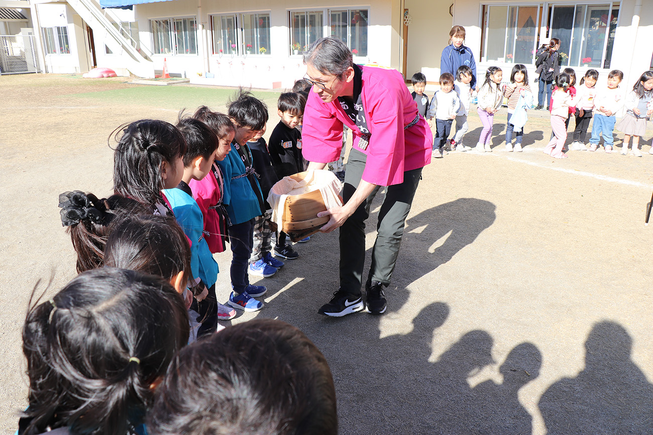 「ペッタンコ!」「それペッタンコ!」と、子どもたちの元気な掛け声が園庭いっぱいに響き渡り、会場はとてもにぎやかな雰囲気に包まれました。子どもたちは「もちつき」の歌をうたいながら、一緒に気分を盛り上げます♪年長組の子どもたちは、小さな杵を手に、実際にもちつき体験にも挑戦!