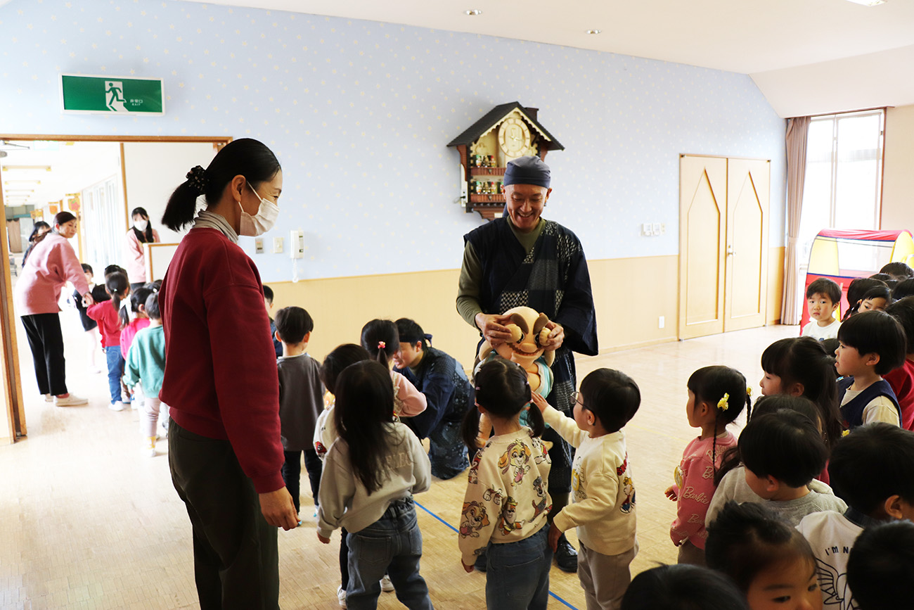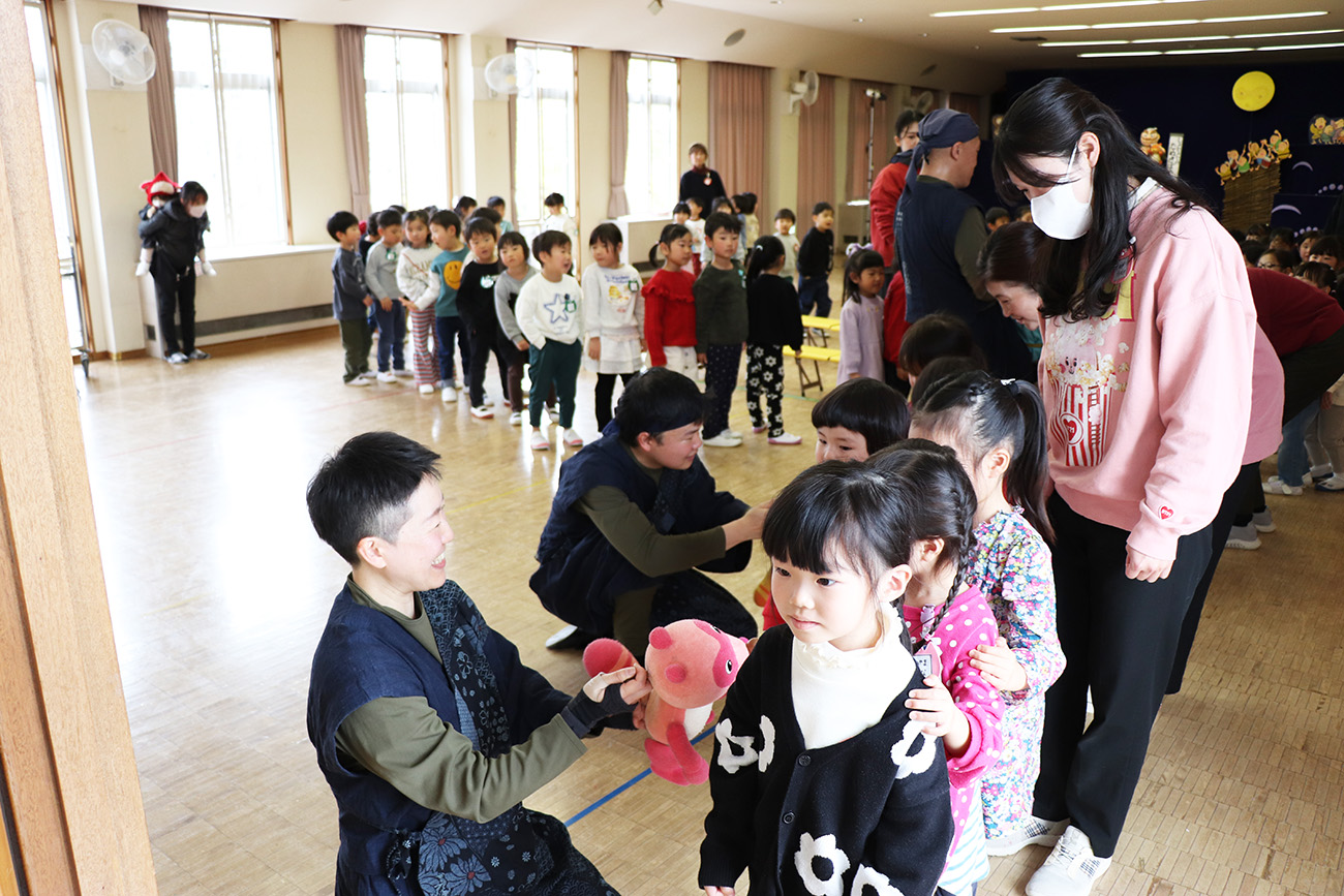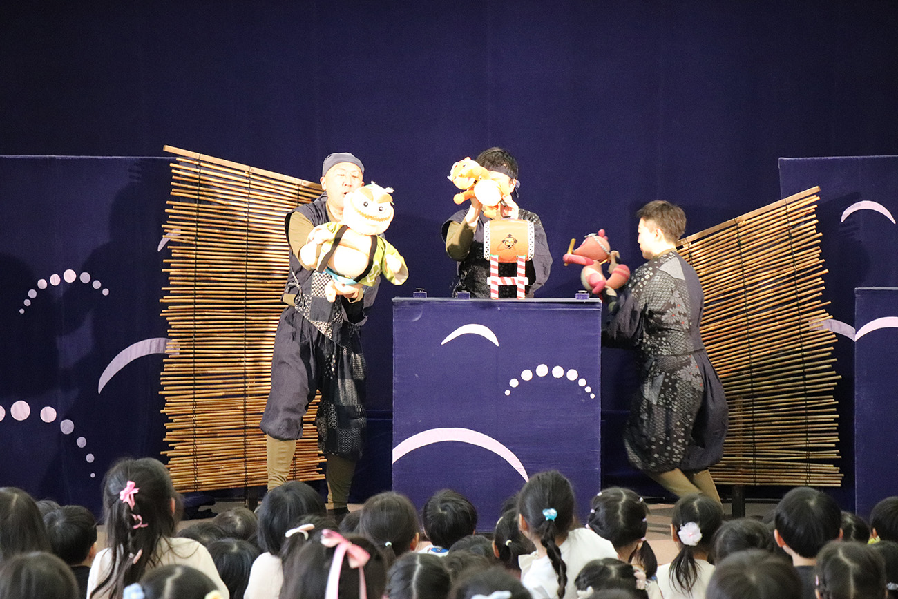 本日、今年もあいわ幼稚園に人形劇団むすび座さんが来園し、 「やんすけと やんすけと やんすけと」 と 「しょじょ寺のたぬきばやし」 の2作品を上演してくださいました!子どもたちは、始まる前からそわそわ…わくわく…!ステージに素敵な背景が登場すると、「なにが始まるの?」「早く見たい!」という空気で会場が一気に盛り上がりました。最初の演目 「やんすけと やんすけと やんすけと」 では、次々と出てくる個性たっぷりの登場人物に、子どもたちは大笑い!「えー!」「どうなるの!?」と声が思わず出てしまう場面もあり、物語の世界にぐんぐん引き込まれていました。人形たちの動きが本当に生きているみたいで、目を丸くして見つめる姿がとても印象的でした。続いての 「しょじょ寺のたぬきばやし」 は、にぎやかで楽しい雰囲気がいっぱい!おなじみの“たぬきばやし”のリズムに、子どもたちの体も自然とゆらゆら♪ 思わず手拍子したくなるような場面もあり、会場全体が明るい笑い声に包まれました。むすび座さんの巧みな人形操作と、心があたたかくなるお話のおかげで、子どもたちは最後まで夢中。終演後には「もう一回見たい!」「また来てほしい!」という声があちこちから聞こえ、大満足の一日となりました。むすび座の皆さん、今年も素敵な時間を本当にありがとうございました!また来年も、楽しみにしています。