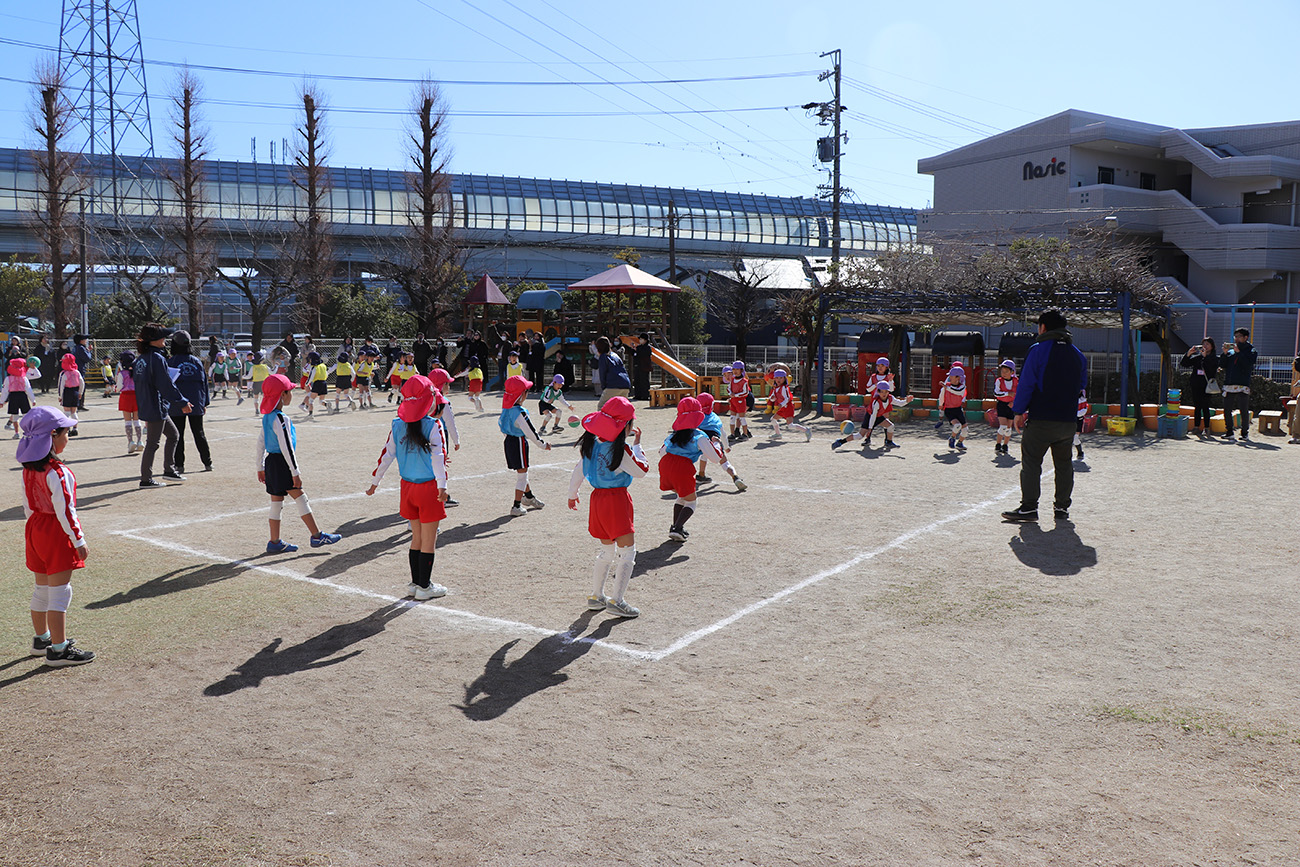 今日は園庭で、年長組のドッジボール大会を開催しました!朝から子どもたちは「ぜったい勝つ!」「がんばるぞー!」と気合い十分。準備体操では元気な掛け声が響き、体も心もあたたまったところで…いよいよ試合スタートです。コートに立った瞬間、表情は一気に真剣モード!